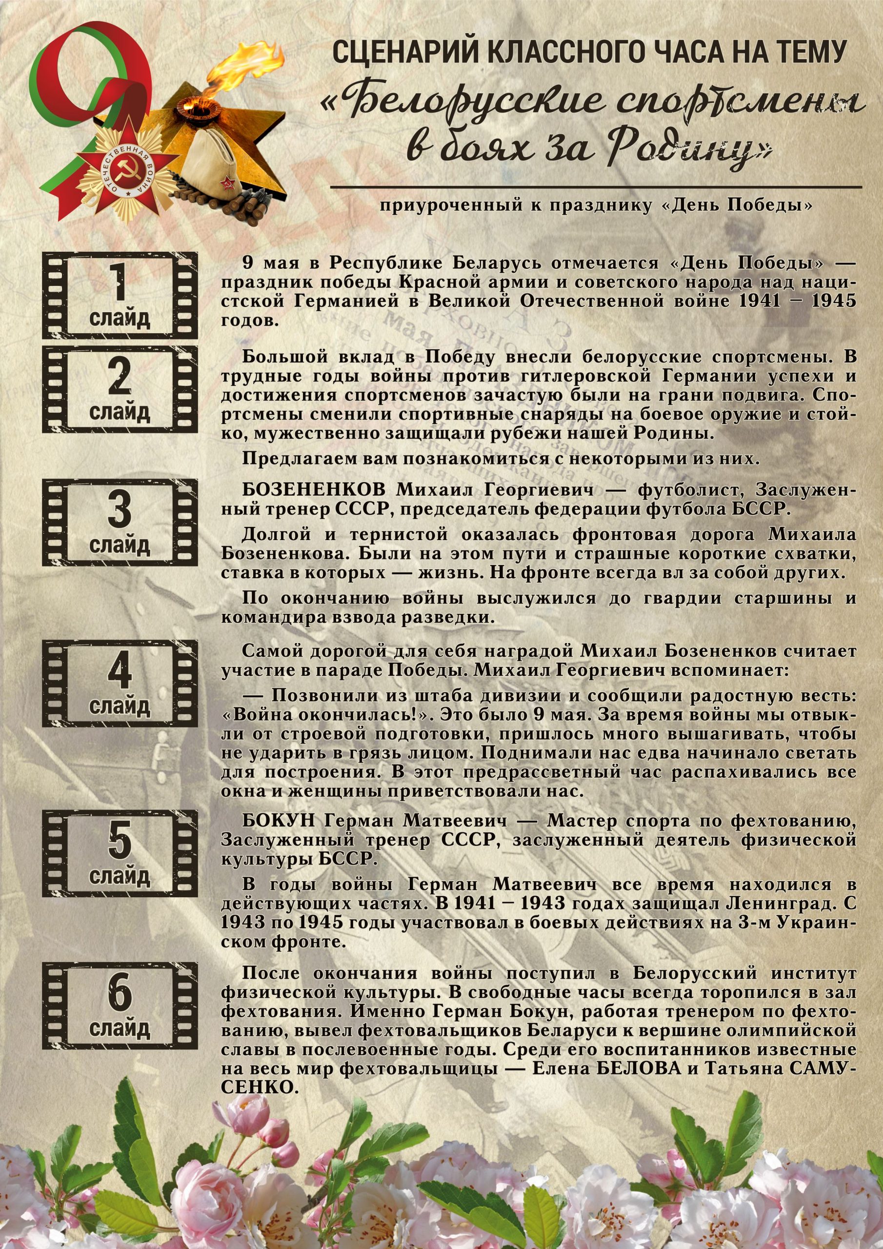 Белорусская олимпийская академия не смогла остаться в стороне и разработала серию плакатов, а также сценарий классного часа с презентацией на тему «Белорусские спортсмены в боях за родину».