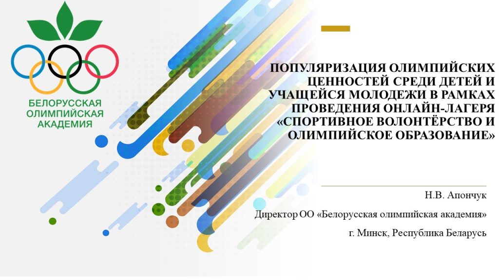 ПОПУЛЯРИЗАЦИЯ ОЛИМПИЙСКИХ ЦЕННОСТЕЙ СРЕДИ ДЕТЕЙ И УЧАЩЕЙСЯ МОЛОДЕЖИ В РАМКАХ ПРОВЕДЕНИЯ ОНЛАЙН-ЛАГЕРЯ «СПОРТИВНОЕ ВОЛОНТЁРСТВО И ОЛИМПИЙСКОЕ ОБРАЗОВАНИЕ», подготовленный Натальей Апончук совместно с Марией Кореневой (кандидат педагогических наук, доцент ФГБОУ ВО «Кубанский государственный университет физической культуры, спорта и туризма», г. Краснодар, Россия).