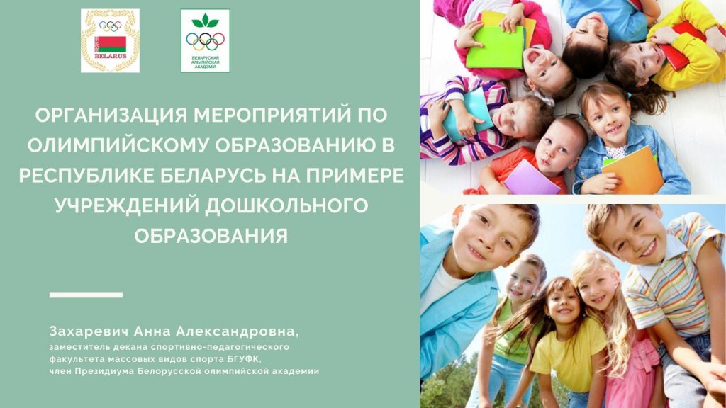 С докладом «ОРГАНИЗАЦИЯ МЕРОПРИЯТИЙ ПО ОЛИМПИЙСКОМУ ОБРАЗОВАНИЮ В РЕСПУБЛИКЕ БЕЛАРУСЬ НА ПРИМЕРЕ УЧРЕЖДЕНИЙ ДОШКОЛЬНОГО ОБРАЗОВАНИЯ» перед участниками конференции выступала Анна Захаревич – магистр педагогических наук, заместитель декана спортивно-педагогического факультета массовых видов спорта БГУФК, член Президиума Белорусской олимпийской академии.