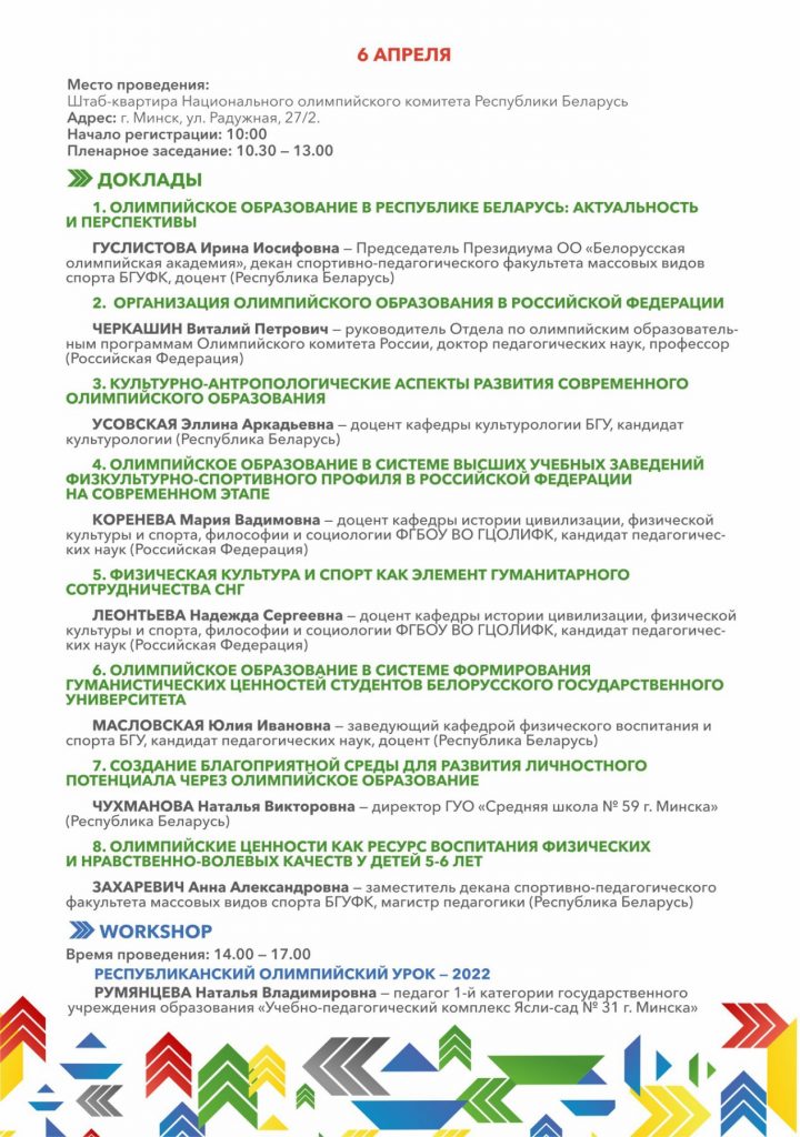 6-7 апреля 2022 года проходит Международная научно-практическая конференции «Олимпийское образование в системе межкультурного взаимодействия», организованная Белорусской олимпийской академией совместно с Белорусским государственным университетом физической культуры и при поддержке Национального олимпийского комитета Республики Беларусь и Министерство спорта и туризма Республики Беларусь.