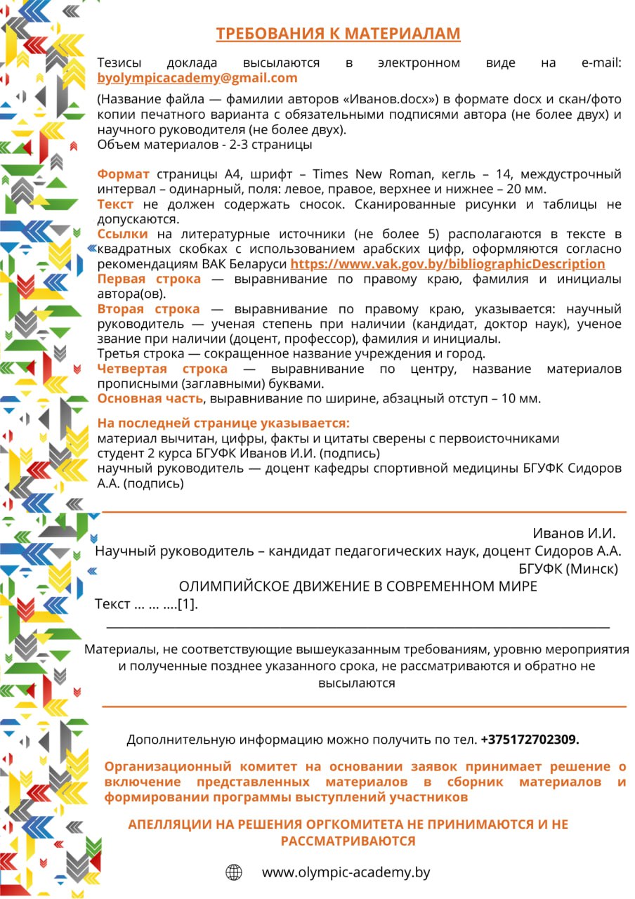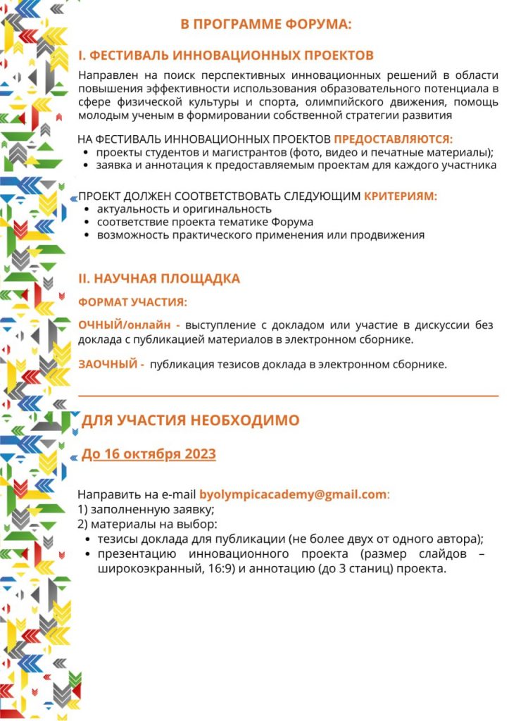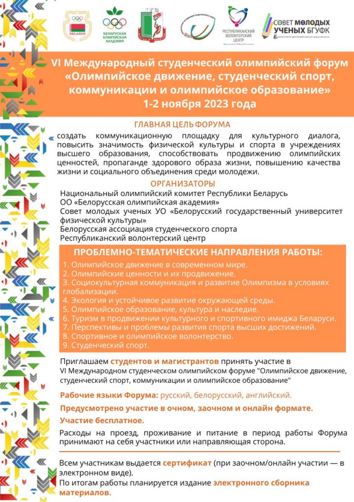 VI Международный студенческий олимпийский форум 1-2 ноября 2023 года СКАЧАТЬ ФОРМУ ЗАЯВКИ СКАЧАТЬ ТРЕБОВАНИЯ К МАТЕРИАЛАМ «Вытокi-Квiз» — финал! «Вместе — за олимпийские ценности и здоровый образ жизни»! Related Posts Подведение итогов курсов повышения квалификации 10.10.2025 9 views Международные эксперты обсудили потенциал олимпийского движения в воспитании молодежи 09.10.2025 18 views Олимпийский кинолекторий в Доме молодежи! 29.09.2025 44 views «Быстрее, Выше, Сильнее – Вместе!» — торжественное открытие музея 24.09.2025 57 views Торжественное открытие «Недели спорта и здоровья» состоялось! 22.09.2025 53 views